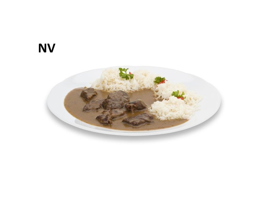 Hovězí maso dušené v jemně nakyslé omáčce s kousky rajčat. Sterilované hotové jídlo bez přílohy.