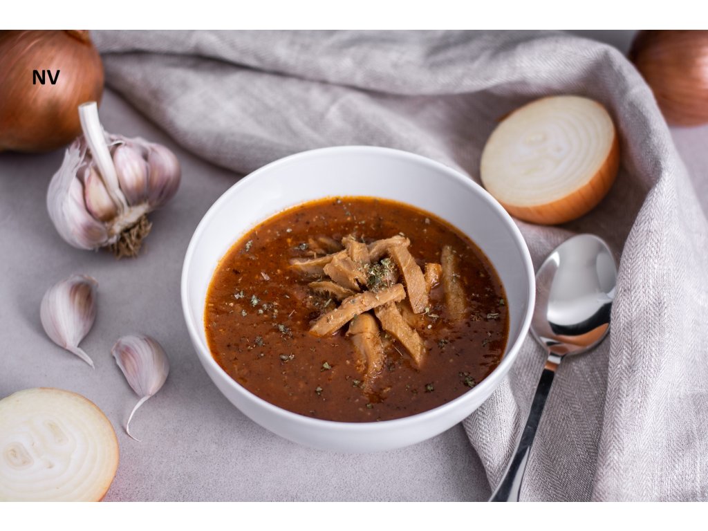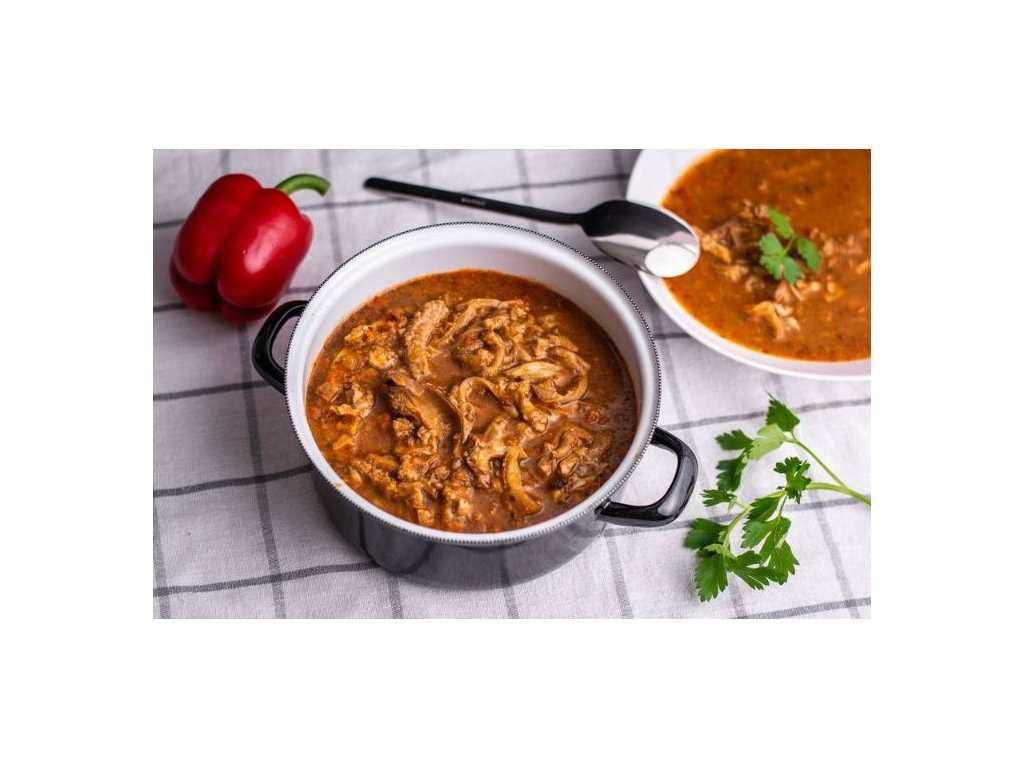 Přesnídávková polévka z hovězích drštěk, s chutí papriky, kmínu, česneku a majoránky. Sterilovaná hotová polévka.