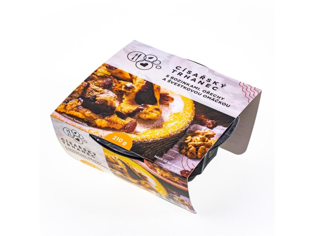 Císařský trhanec s rozinkami, ořechy a švestkovou omáčkou. Chlazené hotové jídlo.