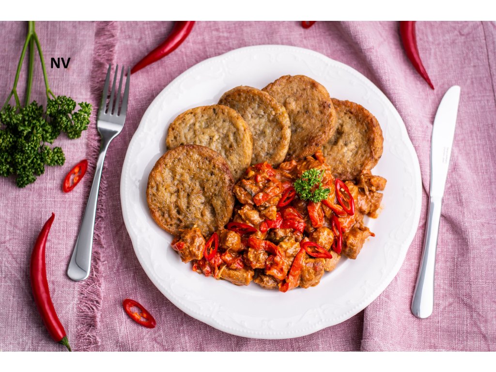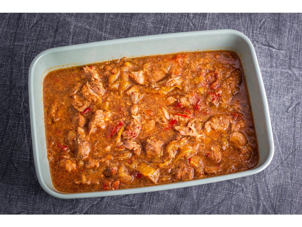 Kousky vepřového masa v pikantní šťávě s rajčaty a paprikou. Sterilované hotové jídlo bez přílohy.