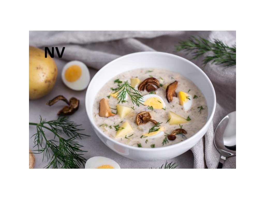 SMETANA, brambory, pitná voda, MLÉKO, vařené loupané VEJCE (slepičí vejce vařená loupaná, nálev [pitná voda, jedlá sůl, ocet kvasný lihový, regulátory kyselosti: kyselina mléčná, kyselina octová; antioxidant: mléčnan sodný]), houbová lesní směs, cukr, MÁSLO, PŠENIČNÁ mouka, vinný ocet (víno bílé, oxid SIŘIČITÝ), sterilovaný kopr (pitná voda, kopr, ocet kvasný, glukózo-fruktózový sirup, jedlá sůl), jedlá sůl, koření