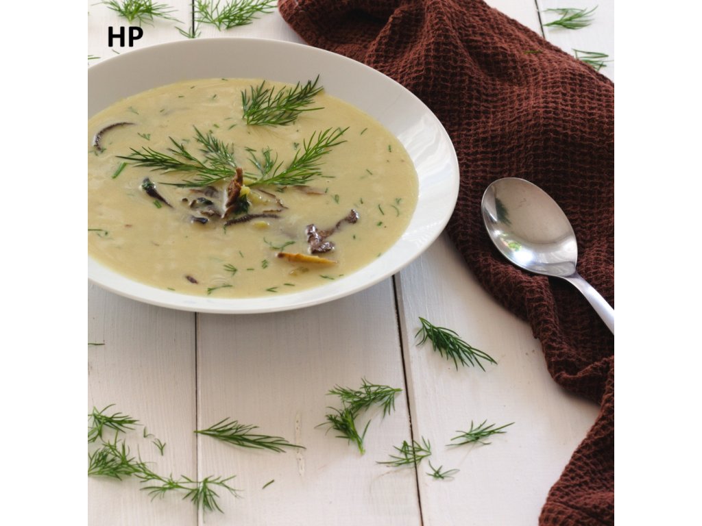Tradiční česká krémová polévka s bramborami, houbami a koprem. Hotové chlazené jídlo.