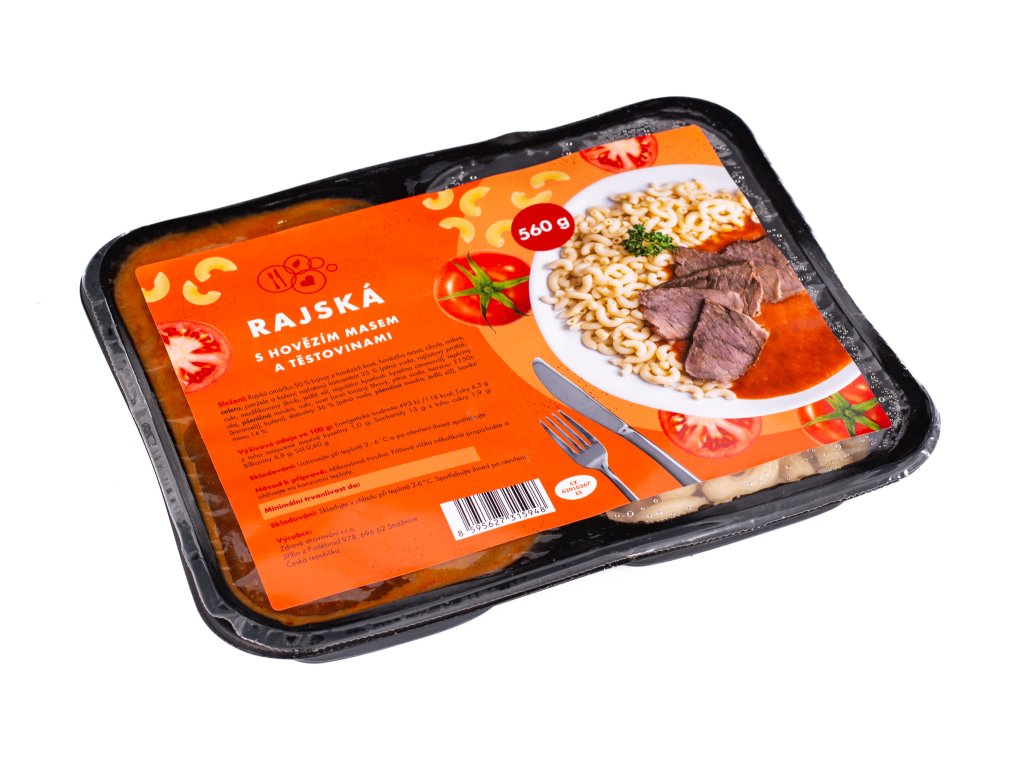 Rajská omáčka s hovězím masem a těstovinami. Chlazené hotové jídlo.