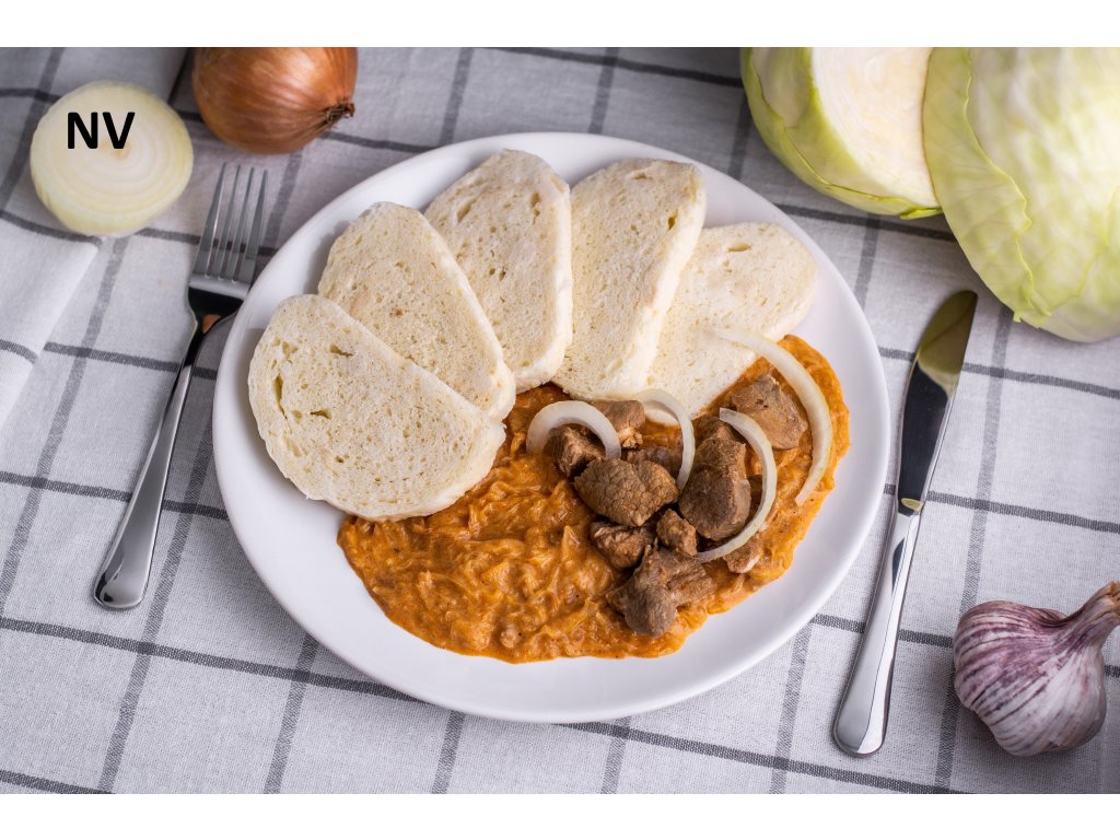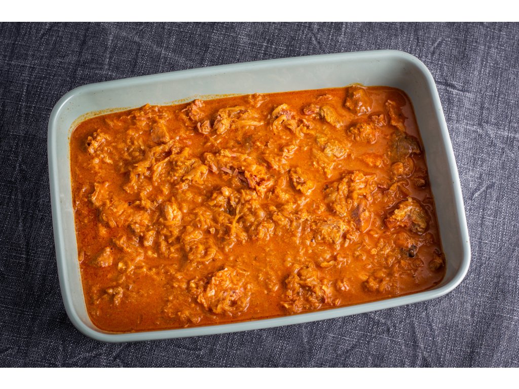 Guláš z kysaného zelí a kousků vepřového masa zjemněný smetanou. Sterilované hotové jídlo bez přílohy.