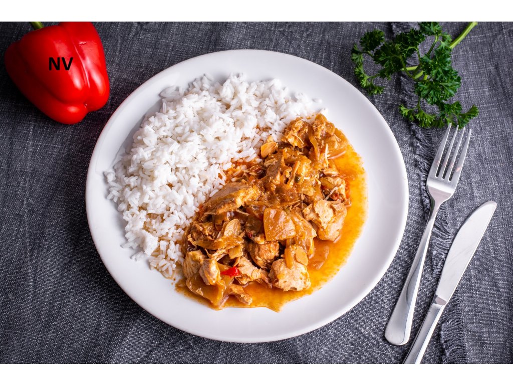 Kuřecí maso v rajčatové sladkokyselé omáčce. Sterilované hotové jídlo bez přílohy.