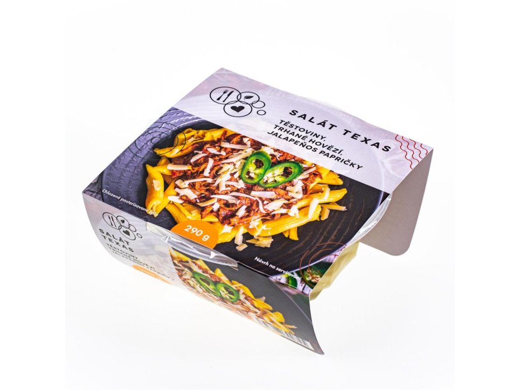 Salát Texas s těstovinami, trhaným hovězím masem a jalapeňos papričkami.. Chlazené hotové jídlo.