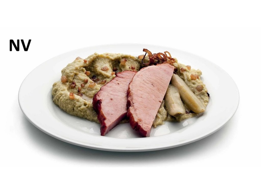 uzené maso 33 % (vepřové maso 77 %, pitná voda, jedlá sůl, bramborový škrob, vepřová bílkovina, cukr, stabilizátory: difosforečnany, trifosforečnany; zahušťovadlo: guma euchema, antioxidant: erythorban sodný, konzervant: dusitan sodný, kouřové aroma), cibule, hrách zelený 19 %, pitná voda, řepkový olej, česnek, petrželová nať, kmín, jedlá sůl, majoránka, pepř