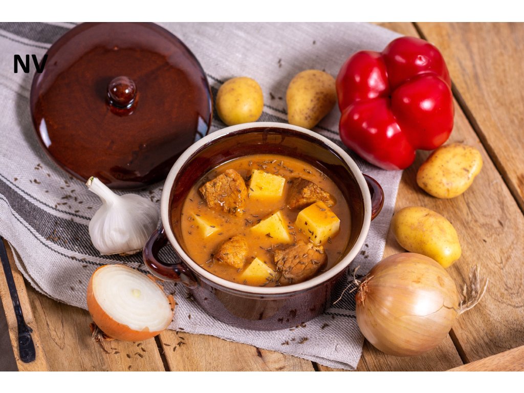 vepřové maso 36 %, brambory 18 %, pitná voda, cibule, vepřové sádlo, pšeničná mouka, rajčatový základ (pitná voda, rajčatový protlak, cukr, zahušťovadlo: modifikovaný kukuřičný škrob, jedlá sůl), koření, česnek, jedlá sůl, hovězí bujon (maltodextrin, jedlá sůl, aromata, extrakt z droždí, hovězí vývar v prášku [hovězí kosti], hovězí tuk [hovězí tuk, antioxidant: výtažky s rozmarýnu], cukr, opečená cibule v prášku, kořen libečku)